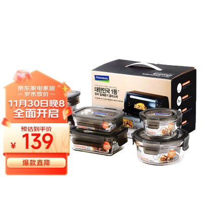 Glasslock进口耐热钢化玻璃保鲜盒微波炉专用饭盒冰箱收纳储存密封6件套s440